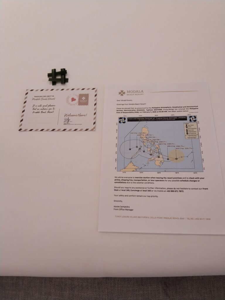 Having a printed copying of the latest weather bureau update about the approaching tropical storm available in the room was not on my bingo card, but well, here we are.